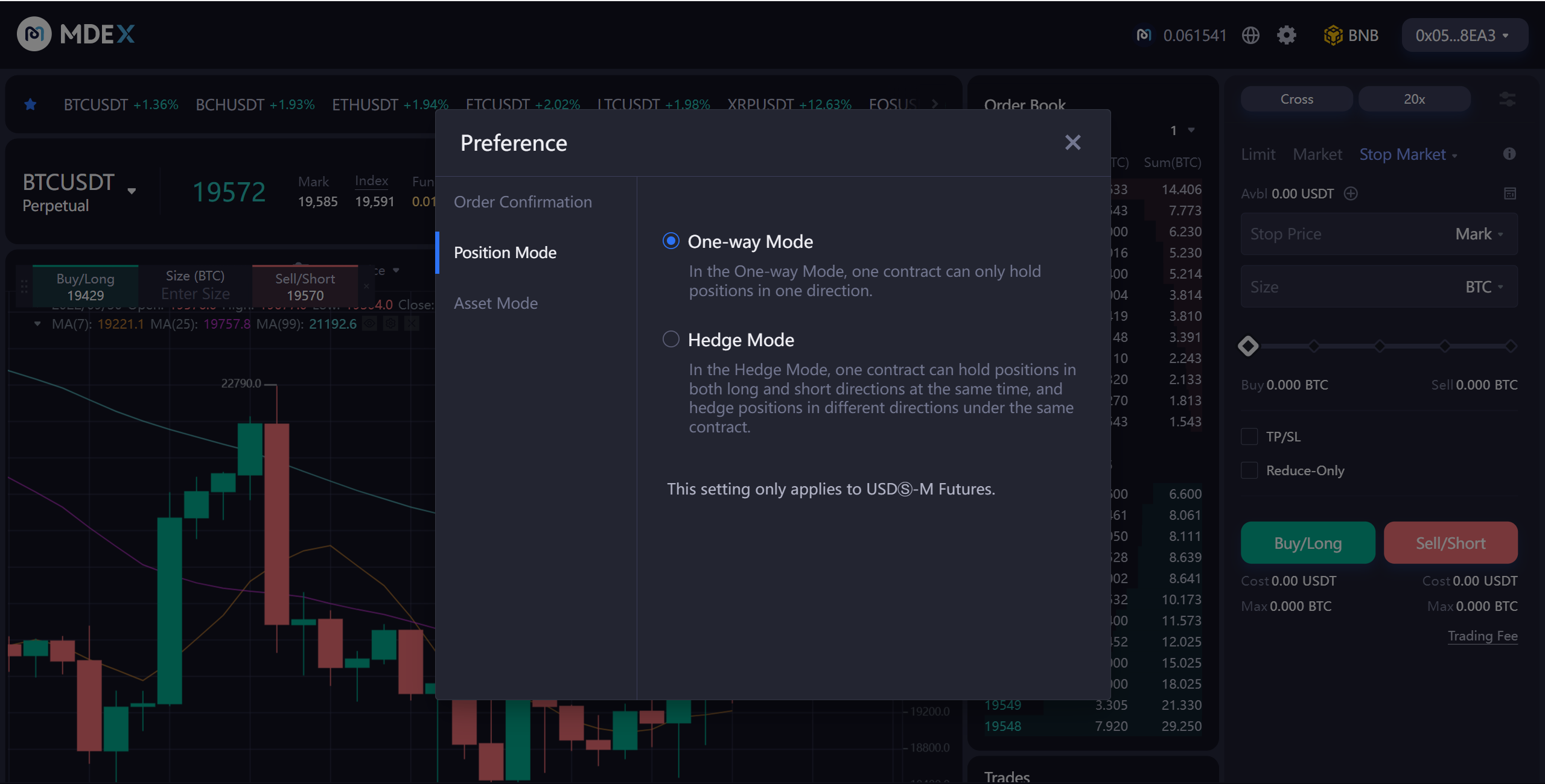 Click the **\[Preference]** icon on the upper right corner of the Order widget and select Hedge Mode, as shown in the figure below.